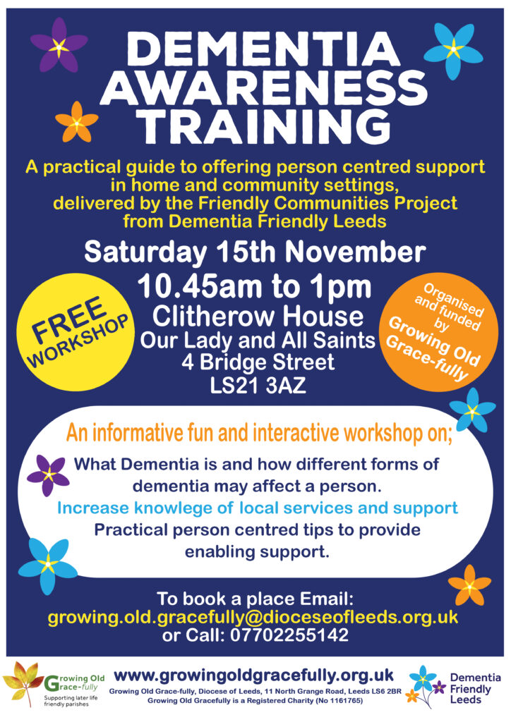 Our Lady and All Saints parish, Otley, is hosting in-person dementia training, focused on how to support people living with dementia, on Saturday 15th November 2025 10.45am – 1.00pm.
